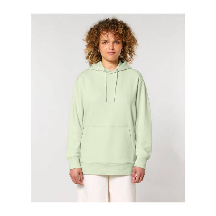 Elegáns uniszex kapucnis pulóver, amely dupla rétegű kapucnival, színben harmonizáló húzózsinórokkal és kenguruzsebbel rendelkezik. Tartós, ikertűs varrással készült, tiszta, kezeletlen természetes nyers pamutból.