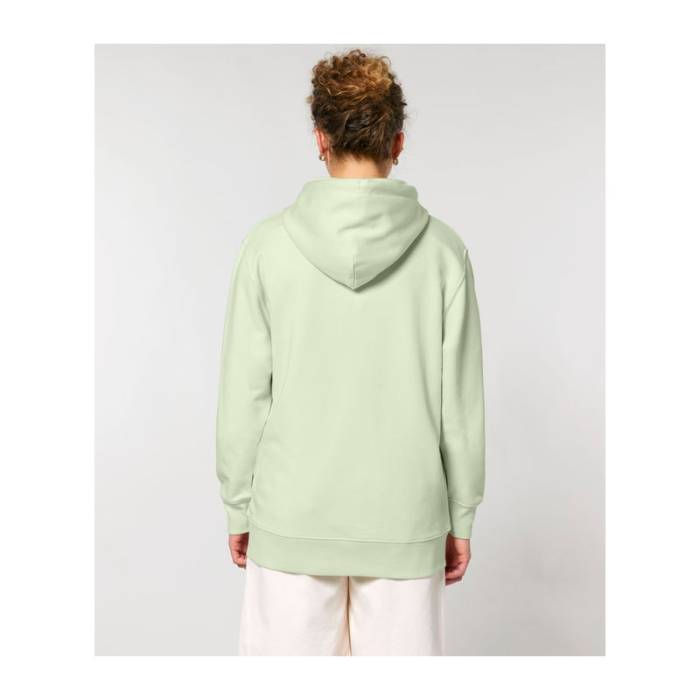 Elegáns uniszex kapucnis pulóver, amely dupla rétegű kapucnival, színben harmonizáló húzózsinórokkal és kenguruzsebbel rendelkezik. Tartós, ikertűs varrással készült, tiszta, kezeletlen természetes nyers pamutból.