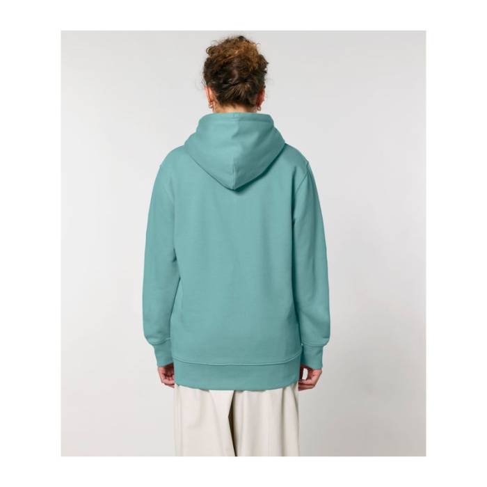 Elegáns uniszex kapucnis pulóver, amely dupla rétegű kapucnival, színben harmonizáló húzózsinórokkal és kenguruzsebbel rendelkezik. Tartós, ikertűs varrással készült, tiszta, kezeletlen természetes nyers pamutból.