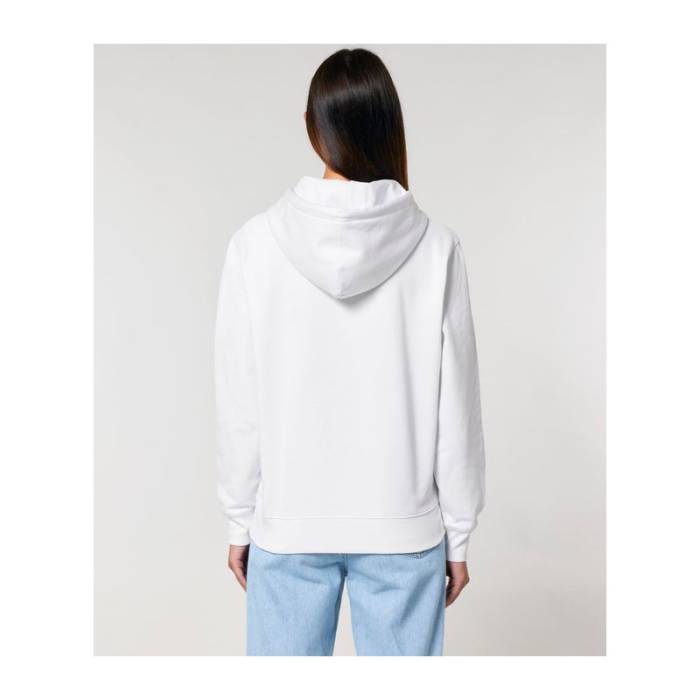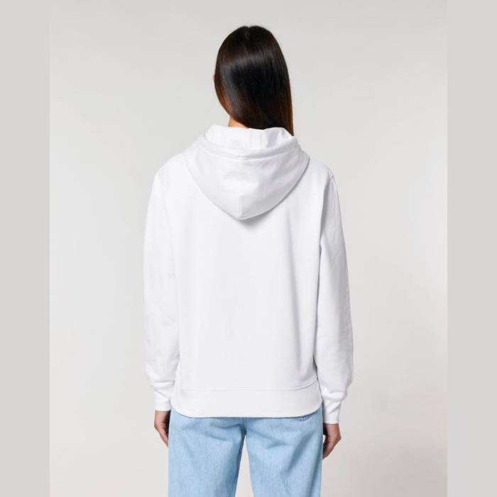 350 g/m² súlyú, bolyhosított polár anyagból készült kapucnis pulóver, dupla rétegű kapucnival, színben harmonizáló húzózsinórokkal és kifogástalan varrással rendelkezik. 100% organikus pamutból készült.