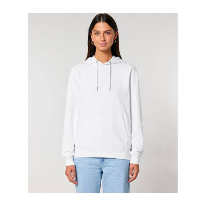 350 g/m² súlyú, bolyhosított polár anyagból készült kapucnis pulóver, dupla rétegű kapucnival, színben harmonizáló húzózsinórokkal és kifogástalan varrással rendelkezik. 100% organikus pamutból készült.