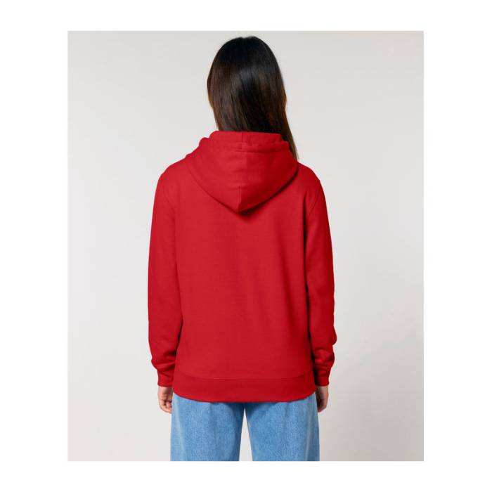 350 g/m² súlyú, bolyhosított polár anyagból készült kapucnis pulóver, dupla rétegű kapucnival, színben harmonizáló húzózsinórokkal és kifogástalan varrással rendelkezik. 100% organikus pamutból készült.