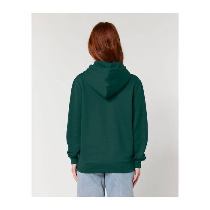 350 g/m² súlyú, bolyhosított polár anyagból készült kapucnis pulóver, dupla rétegű kapucnival, színben harmonizáló húzózsinórokkal és kifogástalan varrással rendelkezik. 100% organikus pamutból készült.