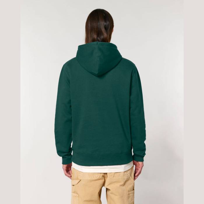 350 g/m² súlyú, bolyhosított polár anyagból készült kapucnis pulóver, dupla rétegű kapucnival, színben harmonizáló húzózsinórokkal és kifogástalan varrással rendelkezik. 100% organikus pamutból készült.