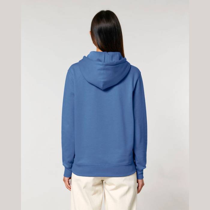 350 g/m² súlyú, bolyhosított polár anyagból készült kapucnis pulóver, dupla rétegű kapucnival, színben harmonizáló húzózsinórokkal és kifogástalan varrással rendelkezik. 100% organikus pamutból készült.