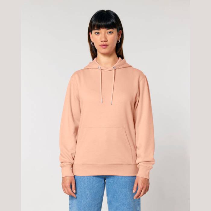 350 g/m² súlyú, bolyhosított polár anyagból készült kapucnis pulóver, dupla rétegű kapucnival, színben harmonizáló húzózsinórokkal és kifogástalan varrással rendelkezik. 100% organikus pamutból készült.