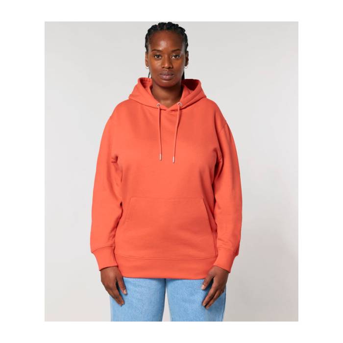 350 g/m² súlyú, bolyhosított polár anyagból készült kapucnis pulóver, dupla rétegű kapucnival, színben harmonizáló húzózsinórokkal és kifogástalan varrással rendelkezik. 100% organikus pamutból készült.