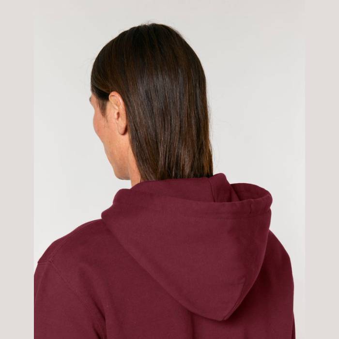350 g/m² súlyú, bolyhosított polár anyagból készült kapucnis pulóver, dupla rétegű kapucnival, színben harmonizáló húzózsinórokkal és kifogástalan varrással rendelkezik. 100% organikus pamutból készült.