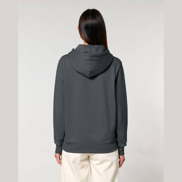 350 g/m² súlyú, bolyhosított polár anyagból készült kapucnis pulóver, dupla rétegű kapucnival, színben harmonizáló húzózsinórokkal és kifogástalan varrással rendelkezik. 100% organikus pamutból készült.