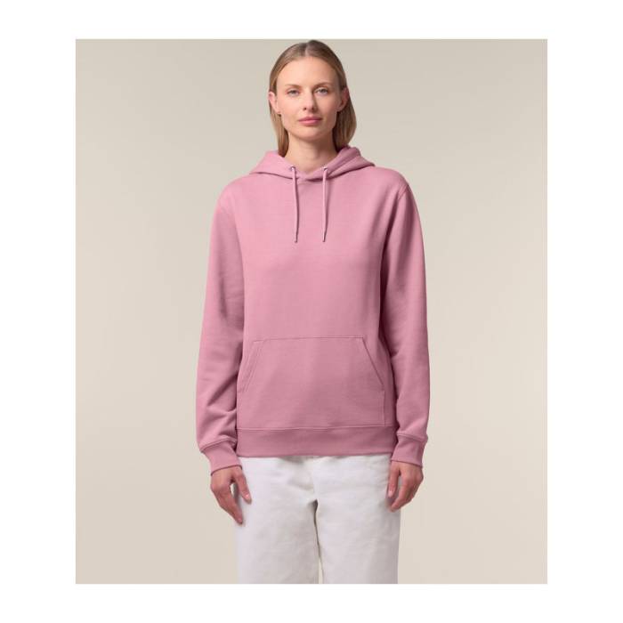 350 g/m² súlyú, bolyhosított polár anyagból készült kapucnis pulóver, dupla rétegű kapucnival, színben harmonizáló húzózsinórokkal és kifogástalan varrással rendelkezik. 100% organikus pamutból készült.