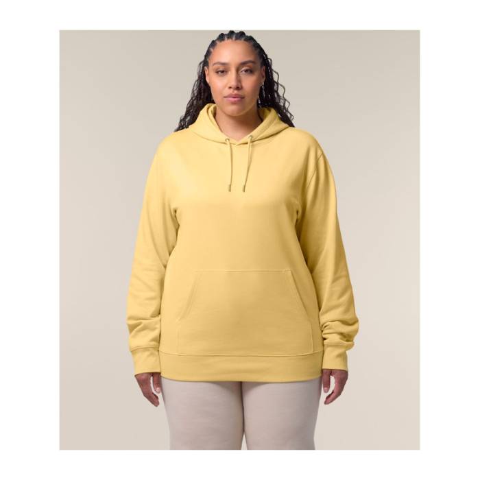 350 g/m² súlyú, bolyhosított polár anyagból készült kapucnis pulóver, dupla rétegű kapucnival, színben harmonizáló húzózsinórokkal és kifogástalan varrással rendelkezik. 100% organikus pamutból készült.