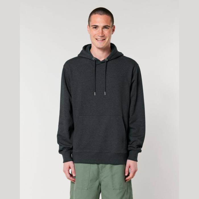 350 g/m² súlyú, bolyhosított polár anyagból készült kapucnis pulóver, dupla rétegű kapucnival, színben harmonizáló húzózsinórokkal és kifogástalan varrással rendelkezik. 100% organikus pamutból készült.