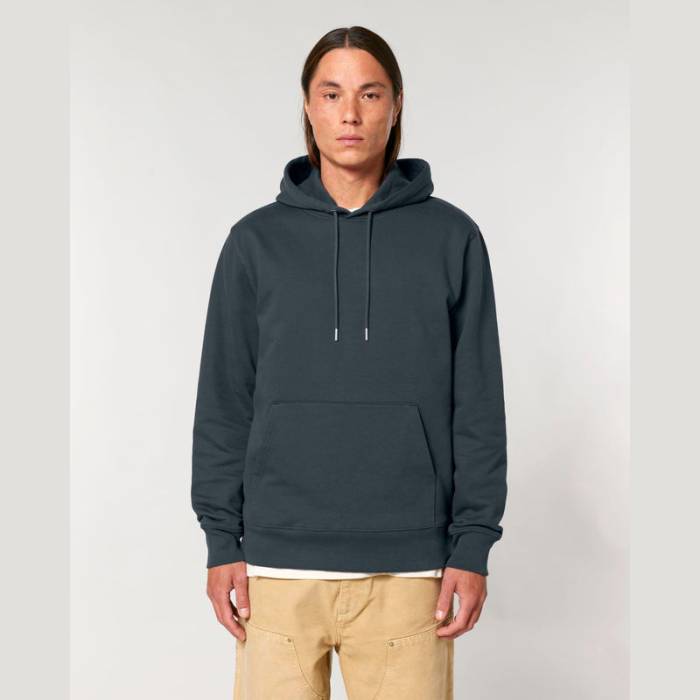 350 g/m² súlyú, bolyhosított polár anyagból készült kapucnis pulóver, dupla rétegű kapucnival, színben harmonizáló húzózsinórokkal és kifogástalan varrással rendelkezik. 100% organikus pamutból készült.