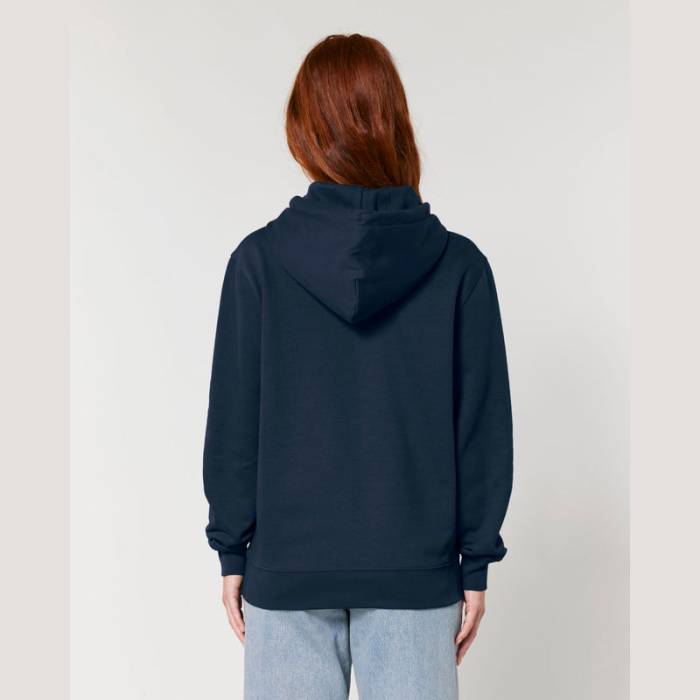 350 g/m² súlyú, bolyhosított polár anyagból készült kapucnis pulóver, dupla rétegű kapucnival, színben harmonizáló húzózsinórokkal és kifogástalan varrással rendelkezik. 100% organikus pamutból készült.