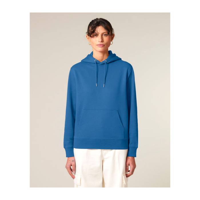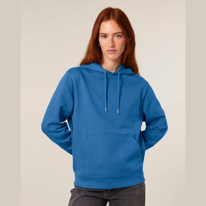 350 g/m² súlyú, bolyhosított polár anyagból készült kapucnis pulóver, dupla rétegű kapucnival, színben harmonizáló húzózsinórokkal és kifogástalan varrással rendelkezik. 100% organikus pamutból készült.