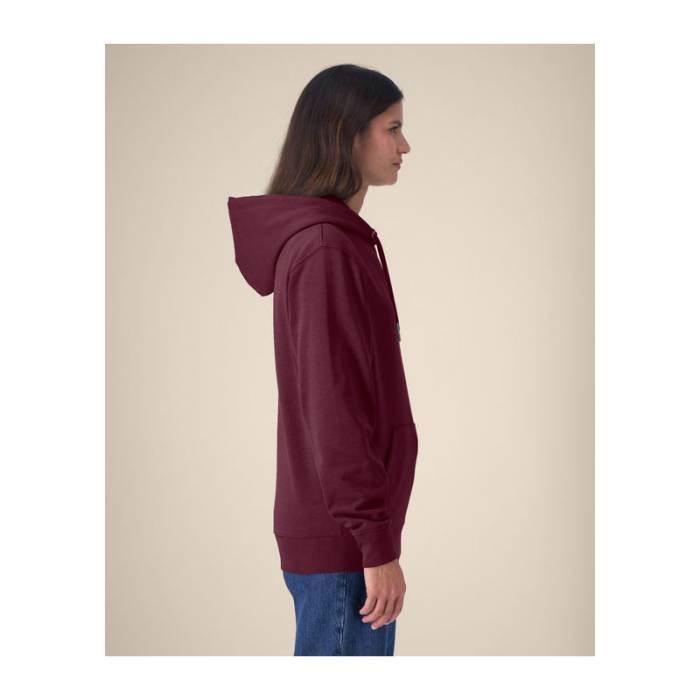 350 g/m² súlyú, bolyhosított polár anyagból készült kapucnis pulóver, dupla rétegű kapucnival, színben harmonizáló húzózsinórokkal és kifogástalan varrással rendelkezik. 100% organikus pamutból készült.