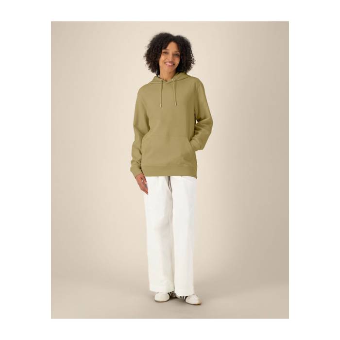 350 g/m² súlyú, bolyhosított polár anyagból készült kapucnis pulóver, dupla rétegű kapucnival, színben harmonizáló húzózsinórokkal és kifogástalan varrással rendelkezik. 100% organikus pamutból készült.