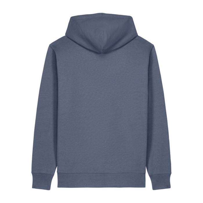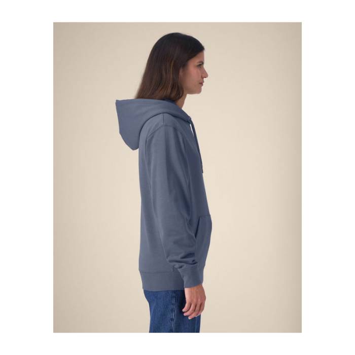 350 g/m² súlyú, bolyhosított polár anyagból készült kapucnis pulóver, dupla rétegű kapucnival, színben harmonizáló húzózsinórokkal és kifogástalan varrással rendelkezik. 100% organikus pamutból készült.
