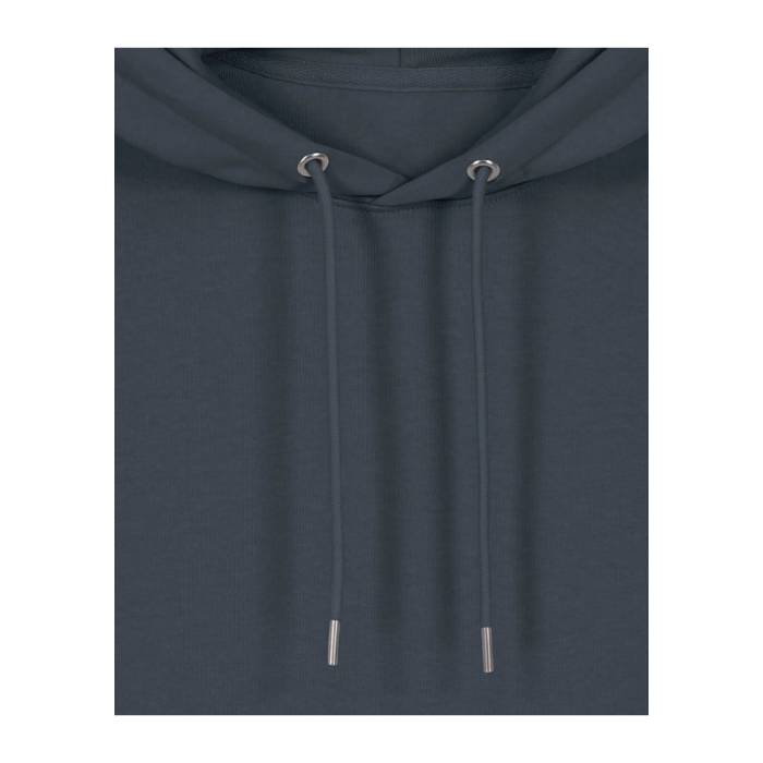 350 g/m² súlyú, bolyhosított polár anyagból készült kapucnis pulóver, dupla rétegű kapucnival, színben harmonizáló húzózsinórokkal és kifogástalan varrással rendelkezik. 100% organikus pamutból készült.