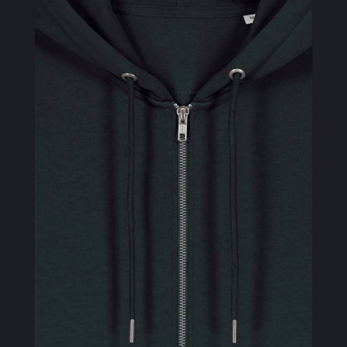 Stílusos, 350 g/m² súlyú, bolyhosított polár kapucnis pulóver modern szabásvonallal, teljes cipzárral és kenguruzsebekkel rendelkezik. 100% organikus pamutból készült.