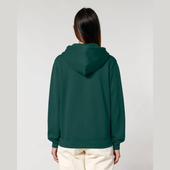 Stílusos, 350 g/m² súlyú, bolyhosított polár kapucnis pulóver modern szabásvonallal, teljes cipzárral és kenguruzsebekkel rendelkezik. 100% organikus pamutból készült.