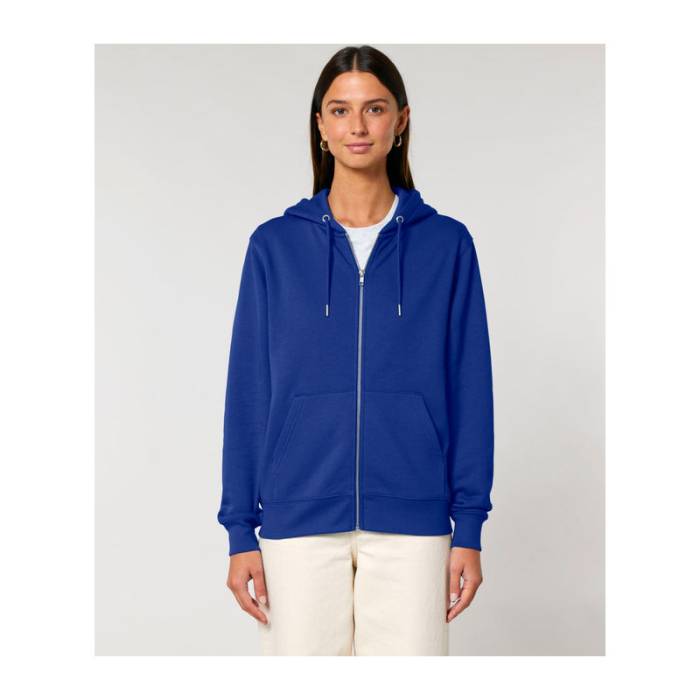Stílusos, 350 g/m² súlyú, bolyhosított polár kapucnis pulóver modern szabásvonallal, teljes cipzárral és kenguruzsebekkel rendelkezik. 100% organikus pamutból készült.