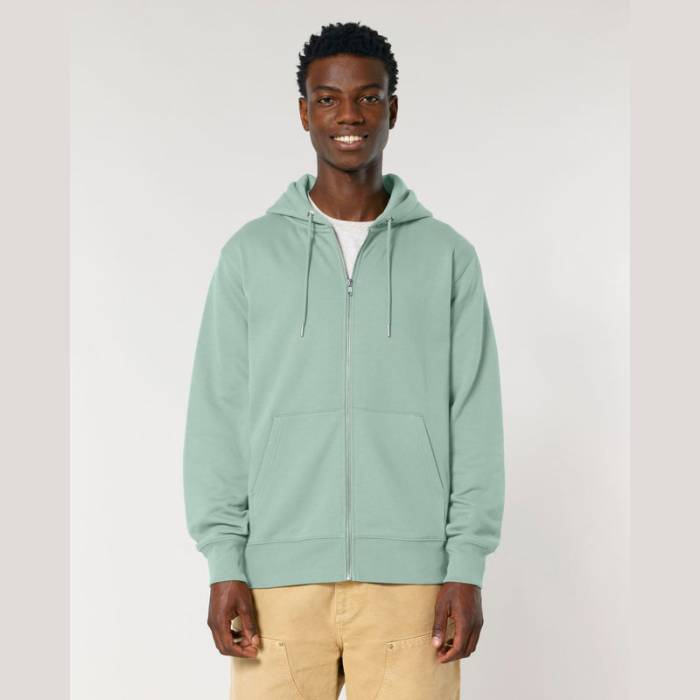 Stílusos, 350 g/m² súlyú, bolyhosított polár kapucnis pulóver modern szabásvonallal, teljes cipzárral és kenguruzsebekkel rendelkezik. 100% organikus pamutból készült.