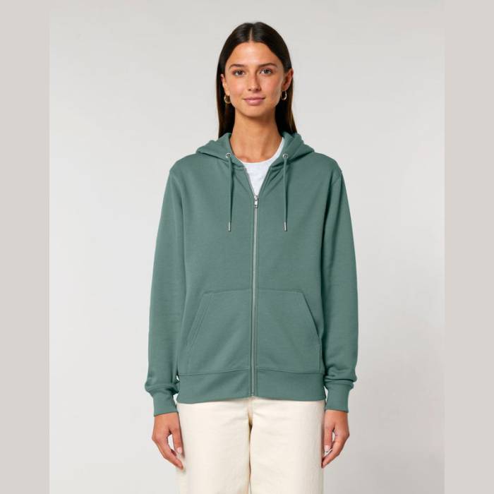 Stílusos, 350 g/m² súlyú, bolyhosított polár kapucnis pulóver modern szabásvonallal, teljes cipzárral és kenguruzsebekkel rendelkezik. 100% organikus pamutból készült.