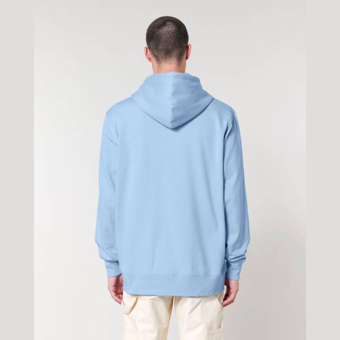 Stílusos, 350 g/m² súlyú, bolyhosított polár kapucnis pulóver modern szabásvonallal, teljes cipzárral és kenguruzsebekkel rendelkezik. 100% organikus pamutból készült.
