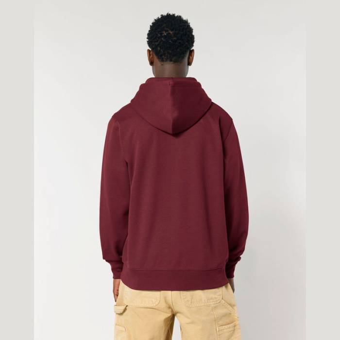 Stílusos, 350 g/m² súlyú, bolyhosított polár kapucnis pulóver modern szabásvonallal, teljes cipzárral és kenguruzsebekkel rendelkezik. 100% organikus pamutból készült.