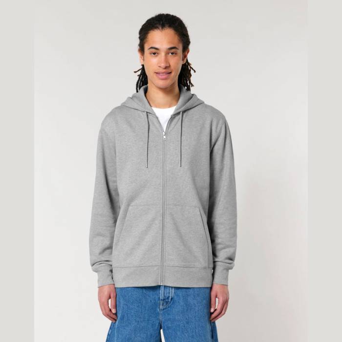 Stílusos, 350 g/m² súlyú, bolyhosított polár kapucnis pulóver modern szabásvonallal, teljes cipzárral és kenguruzsebekkel rendelkezik. 100% organikus pamutból készült.