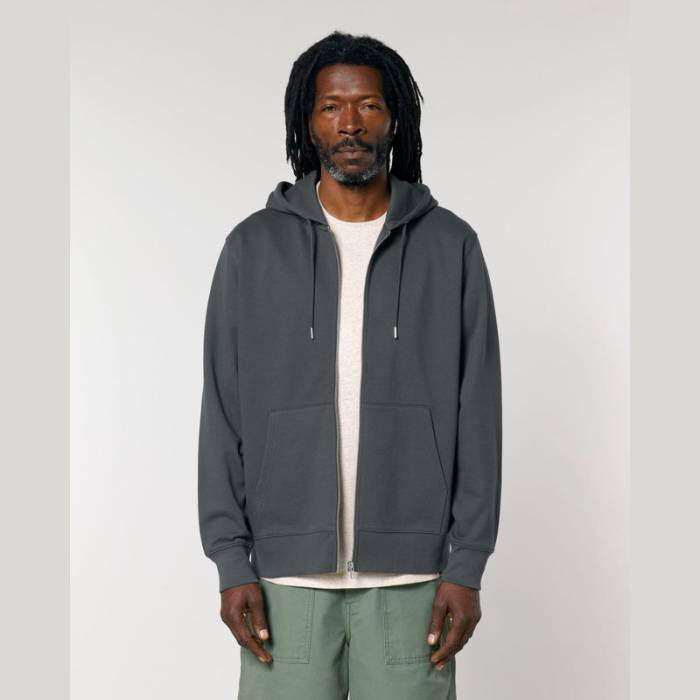 Stílusos, 350 g/m² súlyú, bolyhosított polár kapucnis pulóver modern szabásvonallal, teljes cipzárral és kenguruzsebekkel rendelkezik. 100% organikus pamutból készült.