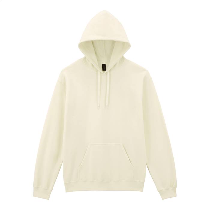 80% pamut és 20% poliészter anyagú, kapucnis pulóver elülső zsebbel. 285 g/m² (fehér 278 g/m²). Gildan márkatermék.