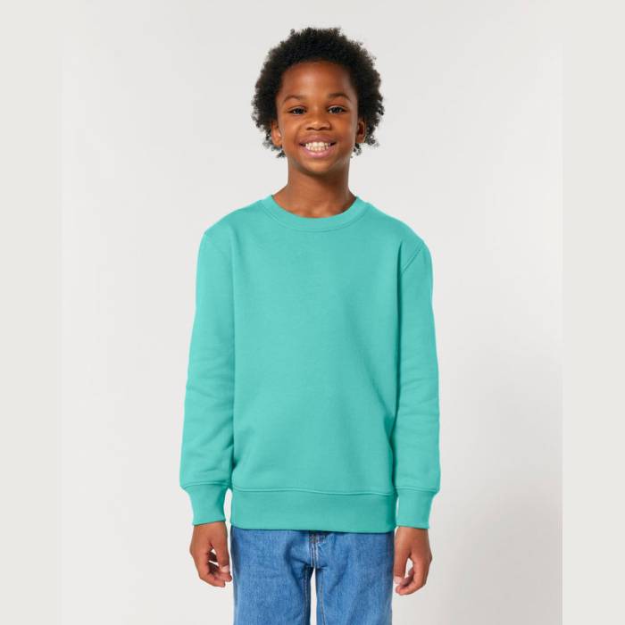 Kiváló minőségű, 300 g/m²-es, kerek nyakú gyerek pulóver, amely 100% organikus pamutból készült. Előmosott, hogy ne zsugorodjon, belül puha, bolyhos anyaggal bélelt. Ideális egyedi emblémázáshoz