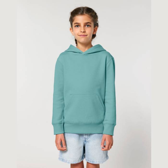 Prémium minőségű, 300 g/m² organikus pamutból készült gyermek kapucnis pulóver, amely dupla bélésű kapucnival, kenguruzsebbel és puha, bolyhos belsővel rendelkezik. Ideális választás családi összeöltözéshez, kiváló emblémázási lehetőségekkel.