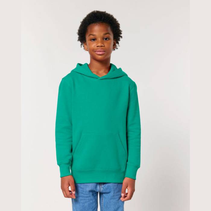 Prémium minőségű, 300 g/m² organikus pamutból készült gyermek kapucnis pulóver, amely dupla bélésű kapucnival, kenguruzsebbel és puha, bolyhos belsővel rendelkezik. Ideális választás családi összeöltözéshez, kiváló emblémázási lehetőségekkel.