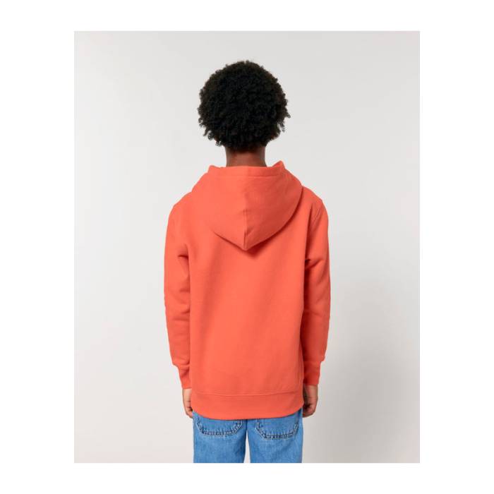 Prémium minőségű, 300 g/m² organikus pamutból készült gyermek kapucnis pulóver, amely dupla bélésű kapucnival, kenguruzsebbel és puha, bolyhos belsővel rendelkezik. Ideális választás családi összeöltözéshez, kiváló emblémázási lehetőségekkel.