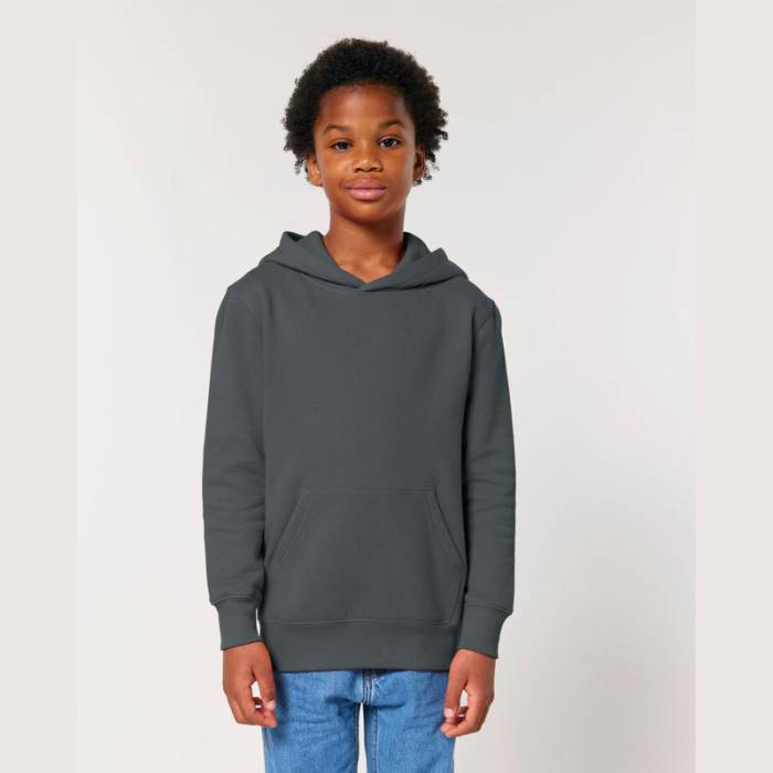 Prémium minőségű, 300 g/m² organikus pamutból készült gyermek kapucnis pulóver, amely dupla bélésű kapucnival, kenguruzsebbel és puha, bolyhos belsővel rendelkezik. Ideális választás családi összeöltözéshez, kiváló emblémázási lehetőségekkel.
