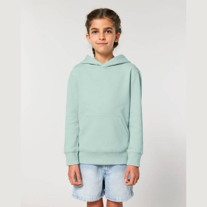 Prémium minőségű, 300 g/m² organikus pamutból készült gyermek kapucnis pulóver, amely dupla bélésű kapucnival, kenguruzsebbel és puha, bolyhos belsővel rendelkezik. Ideális választás családi összeöltözéshez, kiváló emblémázási lehetőségekkel.