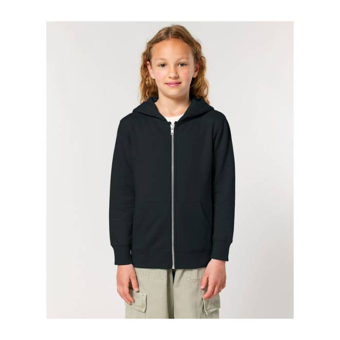 300 g/m² súlyú gyerek kapucnis pulóver kenguruzsebekkel, fém cipzárral és prémium minőségű, dupla bélésű kapucnival. 100% organikus pamutból készült, előmosott, hogy ne zsugorodjon, és tökéletes egyedi emblémázáshoz.