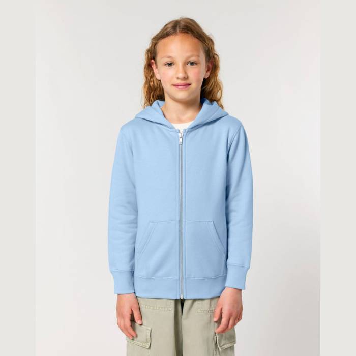 300 g/m² súlyú gyerek kapucnis pulóver kenguruzsebekkel, fém cipzárral és prémium minőségű, dupla bélésű kapucnival. 100% organikus pamutból készült, előmosott, hogy ne zsugorodjon, és tökéletes egyedi emblémázáshoz.