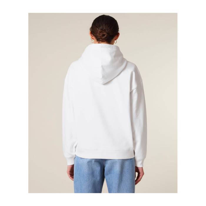 Prémium minőségű, 350 g/m² súlyú oversized kapucnis pulóver, 100% organikus pamutból. Kettős rétegű kapucnival, kenguruzsebbel.