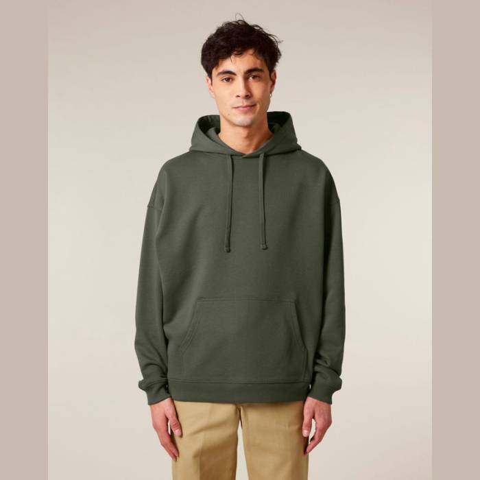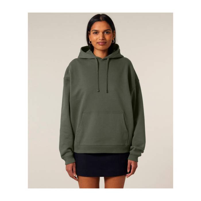 Prémium minőségű, 350 g/m² súlyú oversized kapucnis pulóver, 100% organikus pamutból. Kettős rétegű kapucnival, kenguruzsebbel.
