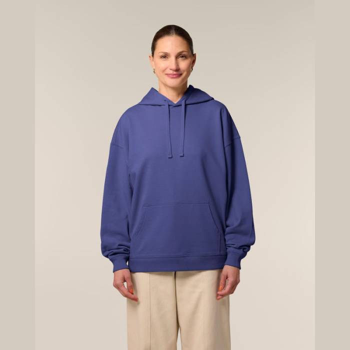 Prémium minőségű, 350 g/m² súlyú oversized kapucnis pulóver, 100% organikus pamutból. Kettős rétegű kapucnival, kenguruzsebbel.