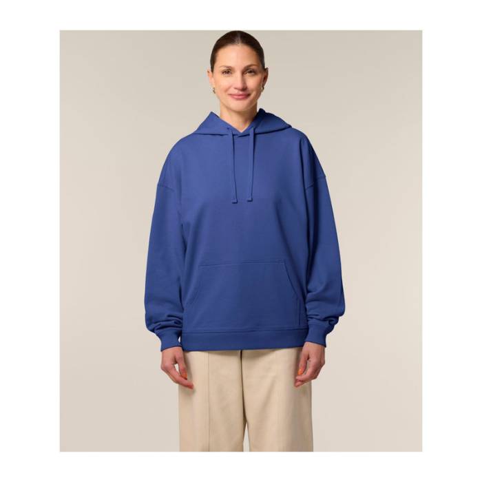 Prémium minőségű, 350 g/m² súlyú oversized kapucnis pulóver, 100% organikus pamutból. Kettős rétegű kapucnival, kenguruzsebbel.