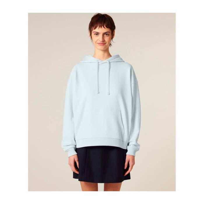 Prémium minőségű, 350 g/m² súlyú oversized kapucnis pulóver, 100% organikus pamutból. Kettős rétegű kapucnival, kenguruzsebbel.