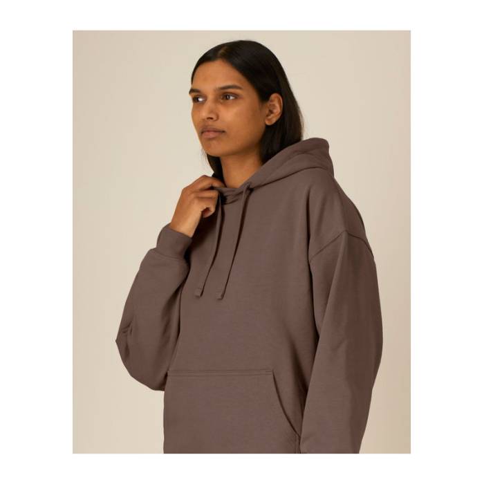 Prémium minőségű, 350 g/m² súlyú oversized kapucnis pulóver, 100% organikus pamutból. Kettős rétegű kapucnival, kenguruzsebbel.