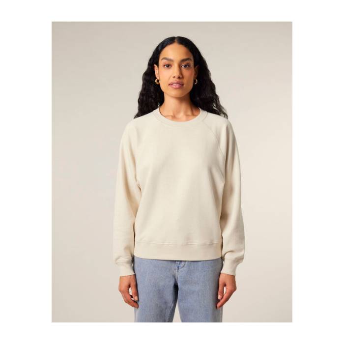 Prémium minőségű, 300 g/m² organikus pamutból készült pulóver, amely raglán ujjaival idézi a klasszikus sportos stílust. Kiemeli az alakot, nőies nyakkivágással rendelkezik. Ideális mindennapi viselethez és egyedi mintákhoz.