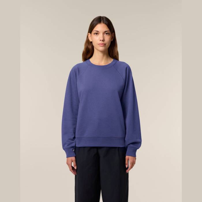 Prémium minőségű, 300 g/m² organikus pamutból készült pulóver, amely raglán ujjaival idézi a klasszikus sportos stílust. Kiemeli az alakot, nőies nyakkivágással rendelkezik. Ideális mindennapi viselethez és egyedi mintákhoz.