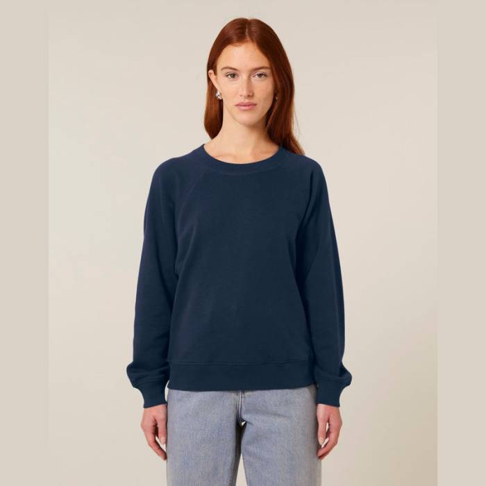 Prémium minőségű, 300 g/m² organikus pamutból készült pulóver, amely raglán ujjaival idézi a klasszikus sportos stílust. Kiemeli az alakot, nőies nyakkivágással rendelkezik. Ideális mindennapi viselethez és egyedi mintákhoz.